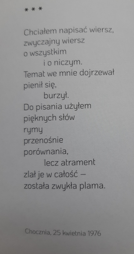 Zachęcam do sięgnięcia po tę publikację, bo przemyślenia Krzysztofa dotyczące sensu życia, poszukiwania własnego miejsca w świecie, miłości i przyjaźni zawarte w krótkich, lapidarnych strofach są z pewnością bliskie wielu z Was. Inspiracją dla Was mogą być także zawarte w posłowiu informacje o autorze, młodym chłopaku z Choczni, który wbrew wszelkim trudnościom, dążył do realizacji własnych marzeń.