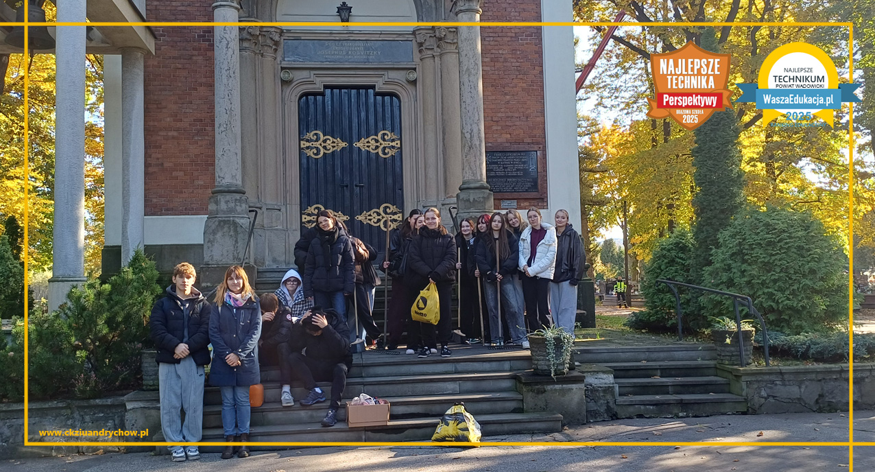 16 października 2025 uczniowie klasy 4tn kontynuując tradycję szkoły, udali się na cmentarz  porządkować zabytkowe nagrobki, zlokalizowane w najstarszej części cmentarza komunalnego w Andrychowie.
